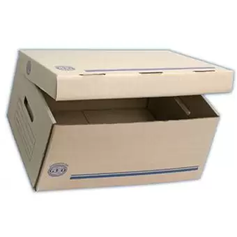 Caja para archivo muerto oficio elaborada con cartón corrugado reforzada en el fondo con agarraderas laterales.