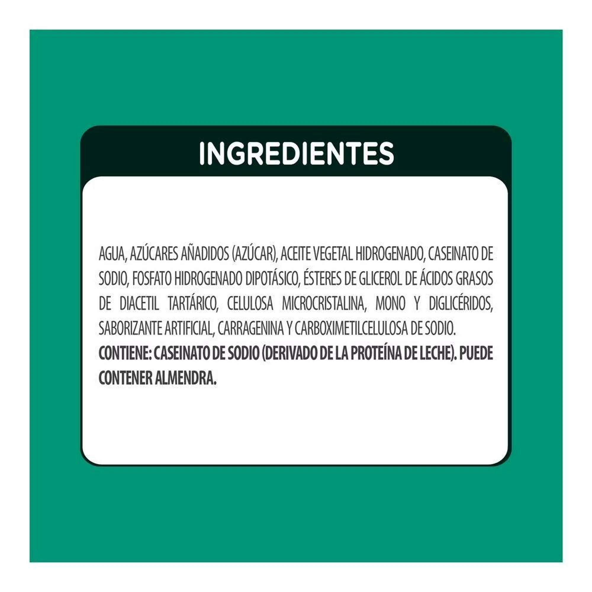 Agua, azúcares añadidos (azúcar), aceite vegetal hidrogenado, caseinato de sodio, fosfato hidrogenado dipotásico, ésteres de mono y diglicéridos del ácido diacetil tartárico, celulosa microcristalina, saborizante artificial, mono y diglicéridos, carragenina y carboximetilcelulosa de sodio.