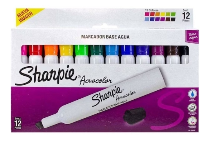 Marcadores Lavables Acuacolor Sharpie. Dale a tus presentaciones, gráficos, mapas o dibujos la luminosidad que merecen con su tinta a base de agua, totalmente lavable y no tóxica, para que trabajes con seguridad. Su punta biselada te ofrece la mejor versatilidad para todo tipo de trazos, puedes hacer líneas finas o coloreados gruesos sin problemas. El diseño de su barril plástico está ideado en ayudarte cuando te deslices por papel, cartón o cartulina y obtengas mejor sujeción. La tapa de seguridad impedirá que se abran por accidente, rayen tu ropa o mochila y se sequen Este paquete incluye 12 marcadores de colores (azul, azul cielo, verde, verde claro, amarillo, naranja, rojo, rosa, morado, negro, café y gris)